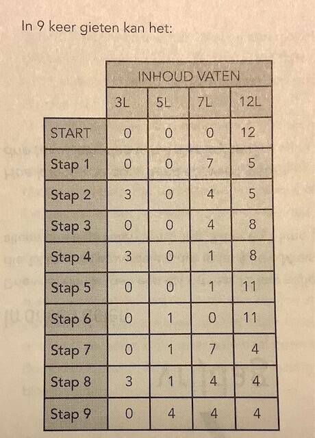 Maar ze hebben enkel drie lege vaten van 3 liter, 5 liter en 7 liter.